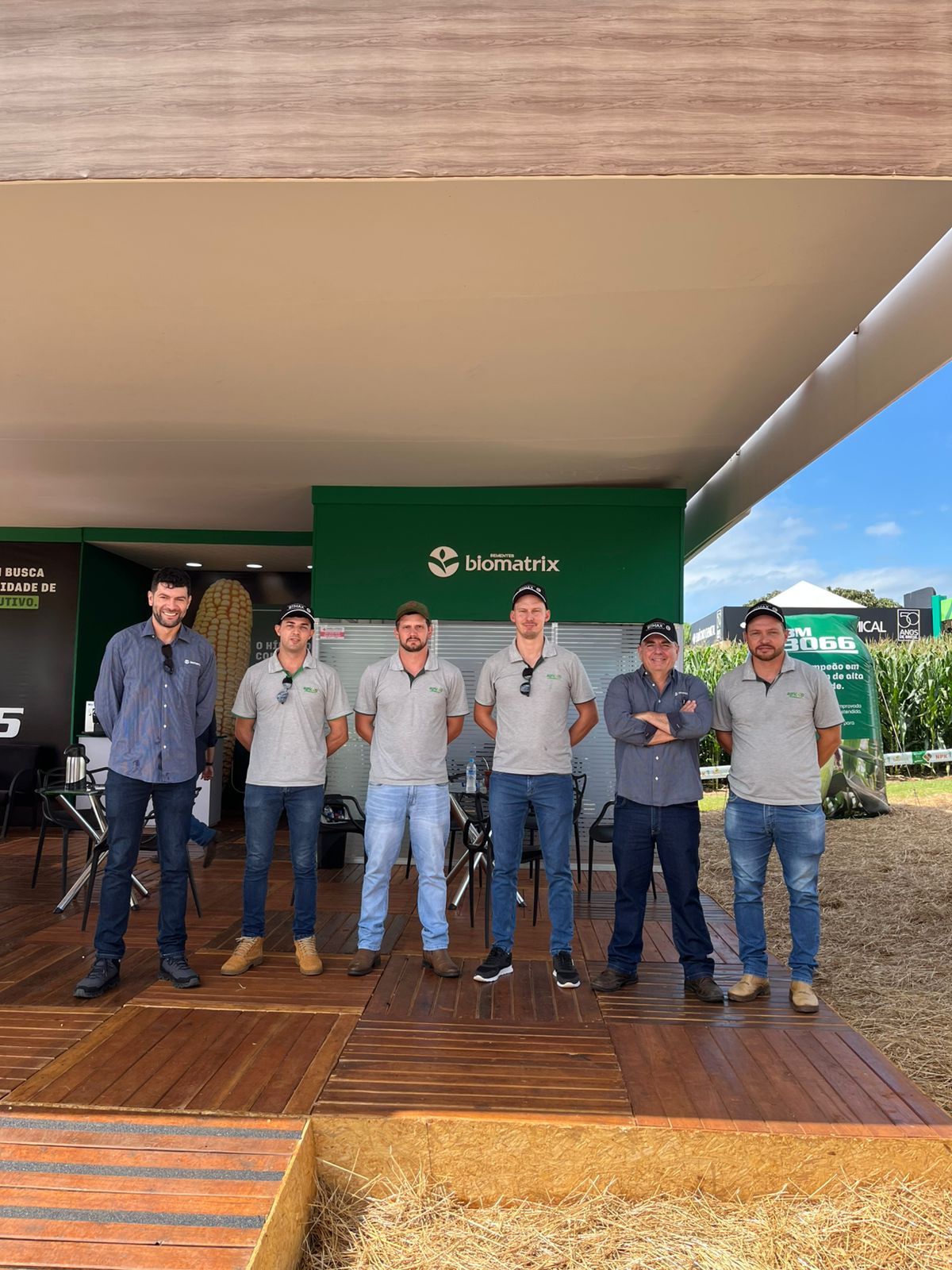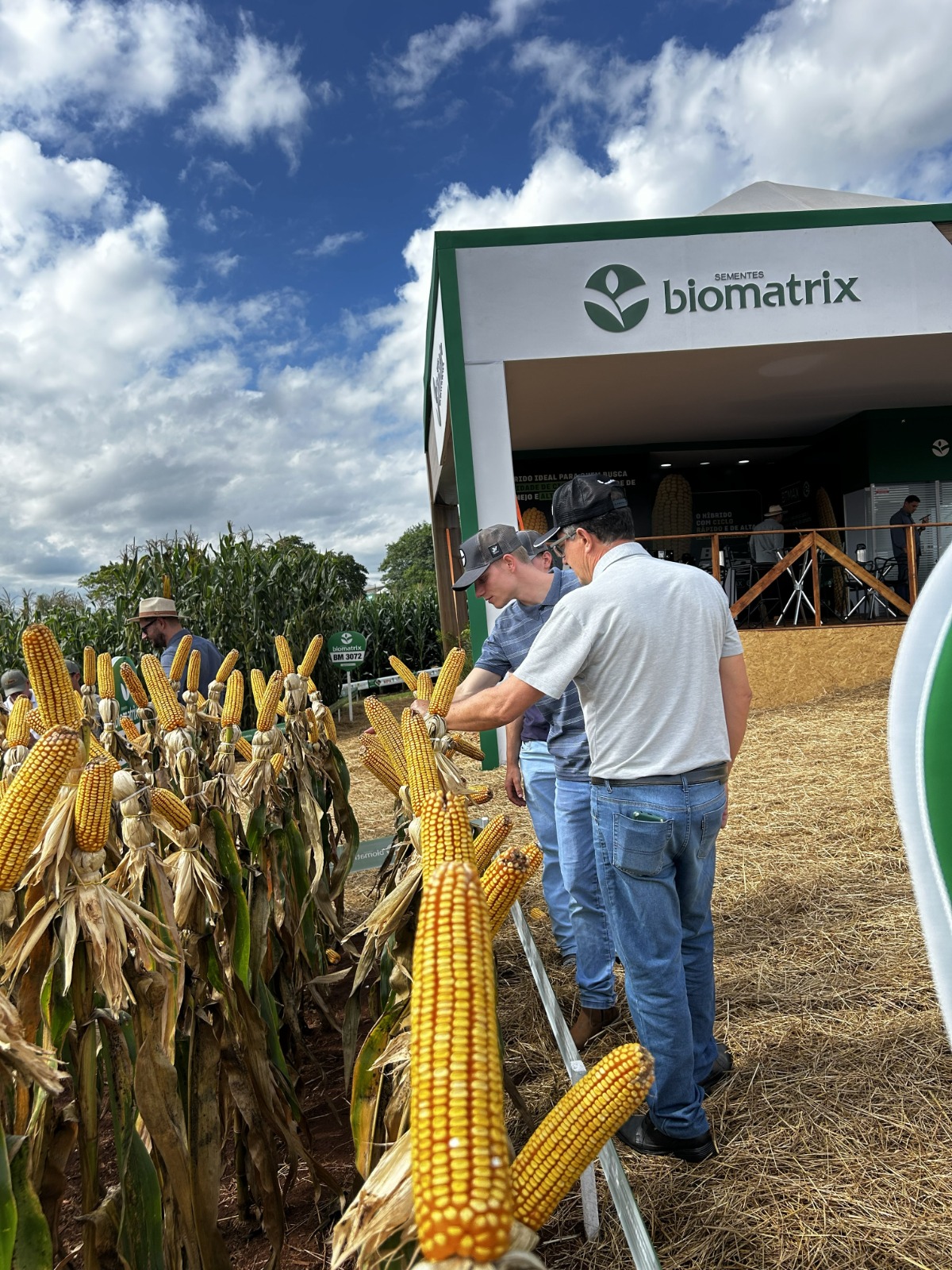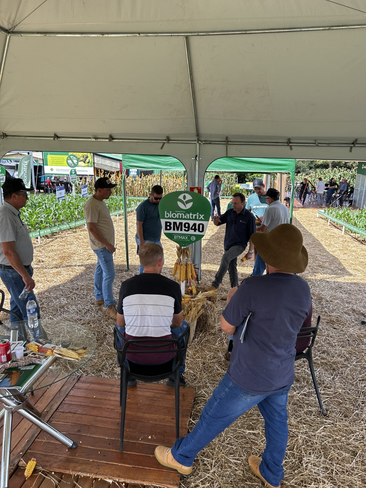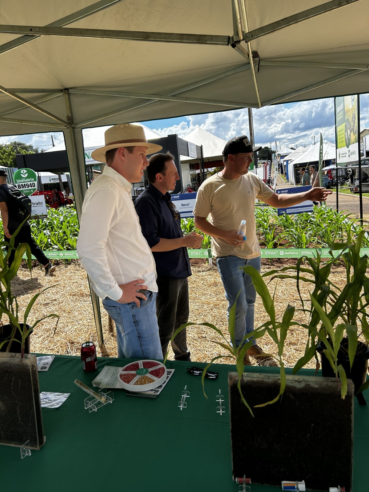No stand da Sementes Biomatrix, os visitantes tiveram a oportunidade de conversar e esclarecer suas duvidas com a equipe técnica presente no evento, desde assuntos relacionados ao manejo de plantas daninhas dos híbridos até falar mais sobre a melhor biotecnologia disponível no mercado para controle da lagarta-do-cartucho do milho, o BTMAX.